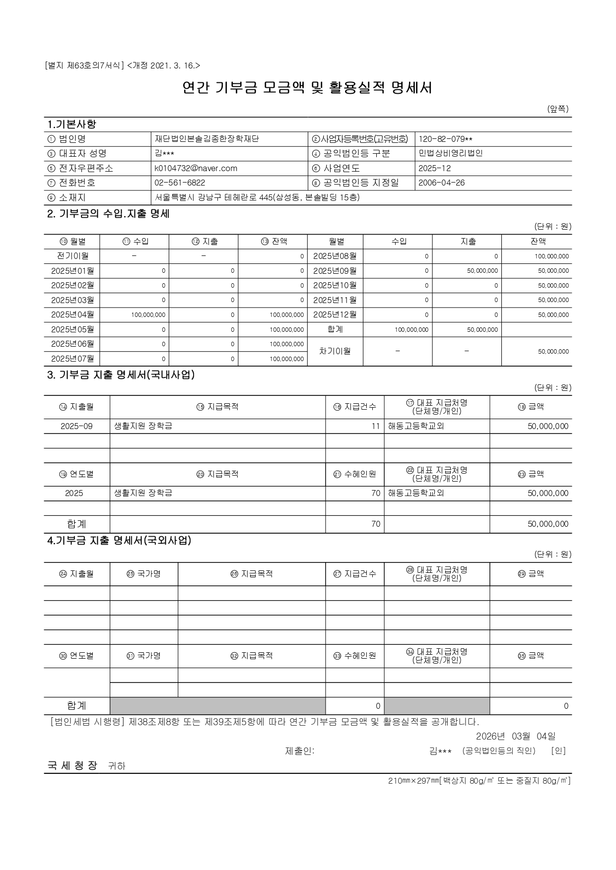 2025년 기부금모금액 및 활용실적명세서